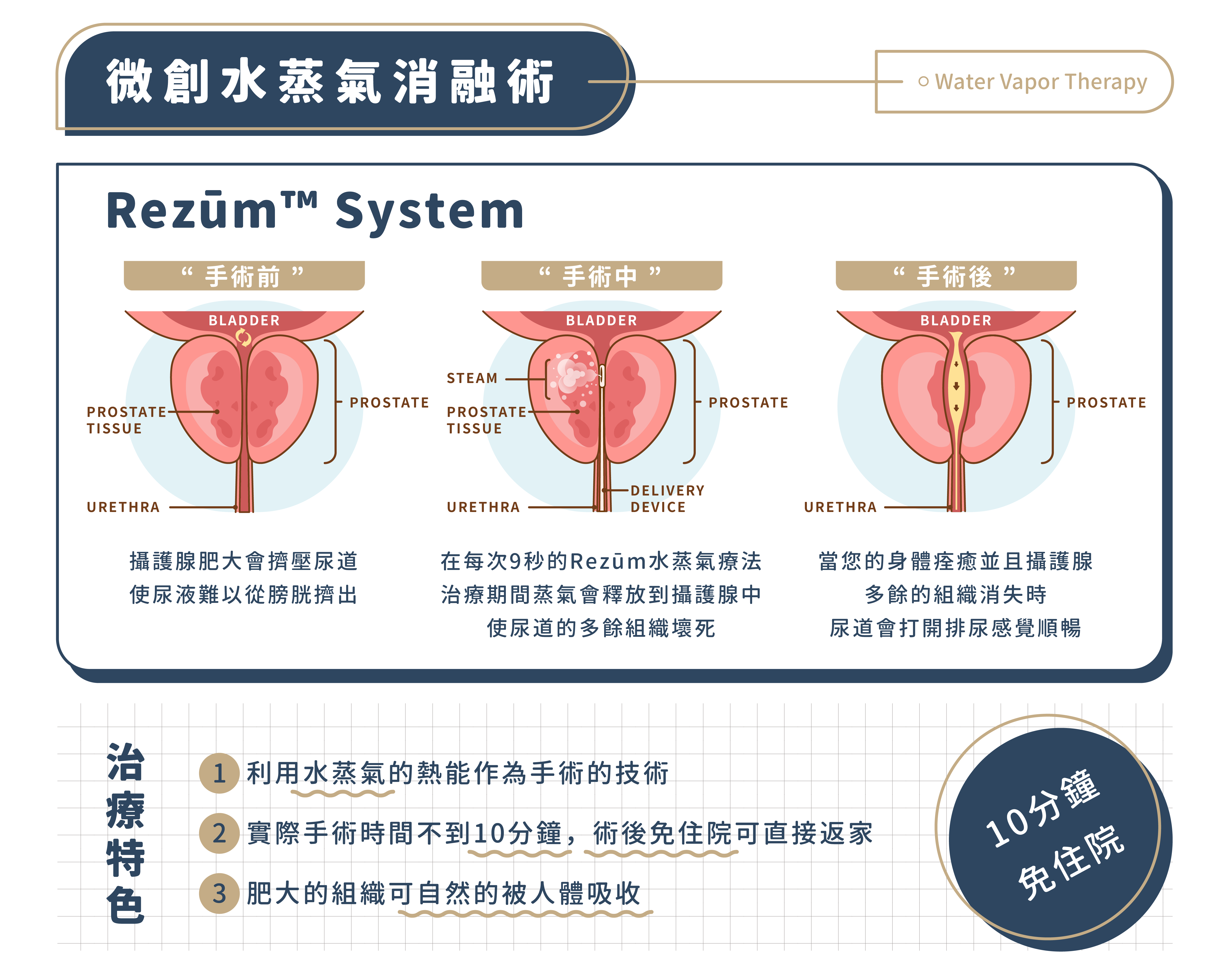 水蒸氣消融 (Rezum)的問世是男性救星,主打「預防性醫療」概念,訴求簡單、快速、有效、回春,讓正值中壯年的您不僅可以藉由它保養攝護腺,更可以避免晚年攝護腺肥大的困擾。針對高齡與高風險患者,Rezum 的高安全和低侵入性,能讓您無痛擺脫夜半解尿滴滴漏到天明的惡夢!
