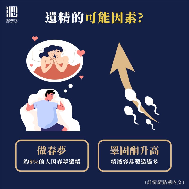 少年時期因為睪固酮開始大量產生,導致精液容易製造過多,晚上睡覺不經意的就自然流出來,另外,當成年男性太久沒有發生射精,等於睪固酮和精液都沒有被消耗,也就會有遺精的現象