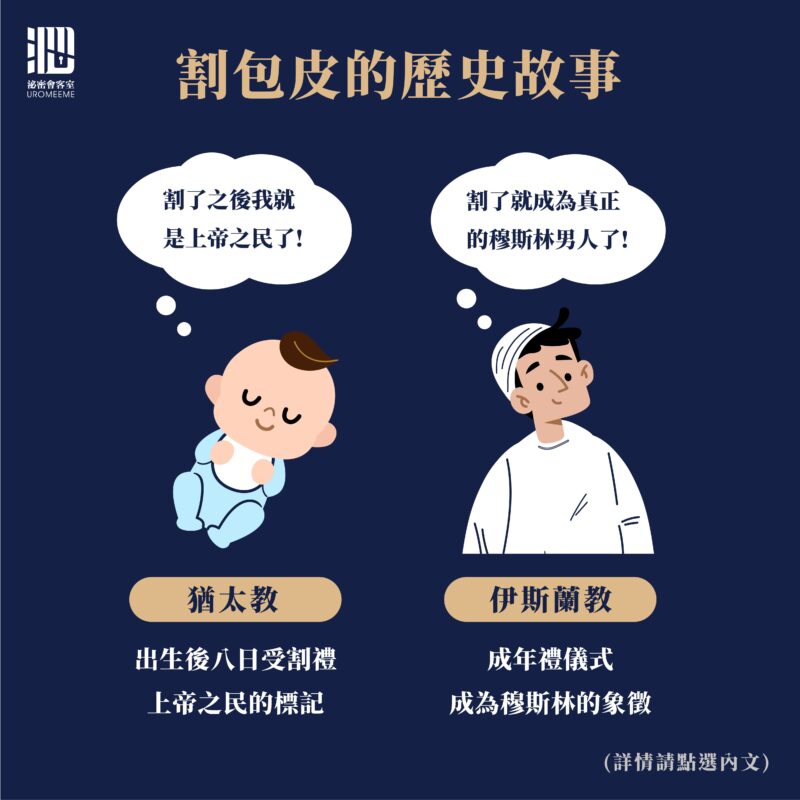 在猶太教的記載中,神耶和華突然對亞伯拉罕說:我要做你和你後裔的神,你們世世代代的男子生下來第八日,都要受割禮。因此猶太教傳統,男嬰出生後第8天要舉行切除生殖器包皮的儀式,被視為成為上帝之民的標記,嬰兒在手術時將會接受家人親友的祝福,而手術是由教士負責執行。