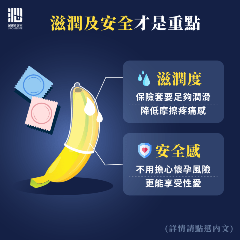 對於女孩們來說,其實他們更在乎保險套另一個成分:「潤滑液」,根據女性們的回饋,會影響到做愛高潮與否的是有一點點痛痛的摩擦感、或者在男生要進入前,一瞬間會有點被撐開的撕裂感,試想今天假設你的GG上有傷口,每一下摩擦都疼痛,這樣你有辦法好好享受嗎?就更不要提高潮了…。因此比起薄不薄,滋潤與否反而是選保險套的重要關鍵,甚至有部分的女性,是因為有戴保險套,不用擔心會懷孕的風險,更能享受性愛的過程,相對的薄、顆粒感、螺旋痕,這都是後話,有足夠的滋潤以及安全,這些才是加分!